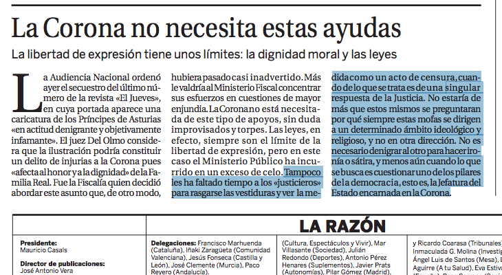 En aquestes dues ocasions, cap polític o mitjà de comunicació va plegar al cel per la censura ni va denunciar-la directament, més aviat tot el contrari. Mitjans com La Razòn el van justificar emparant-se en els límits morals i ètics de la llibertat d´expressió. Sembla que aleshores sí que hi havia límits.